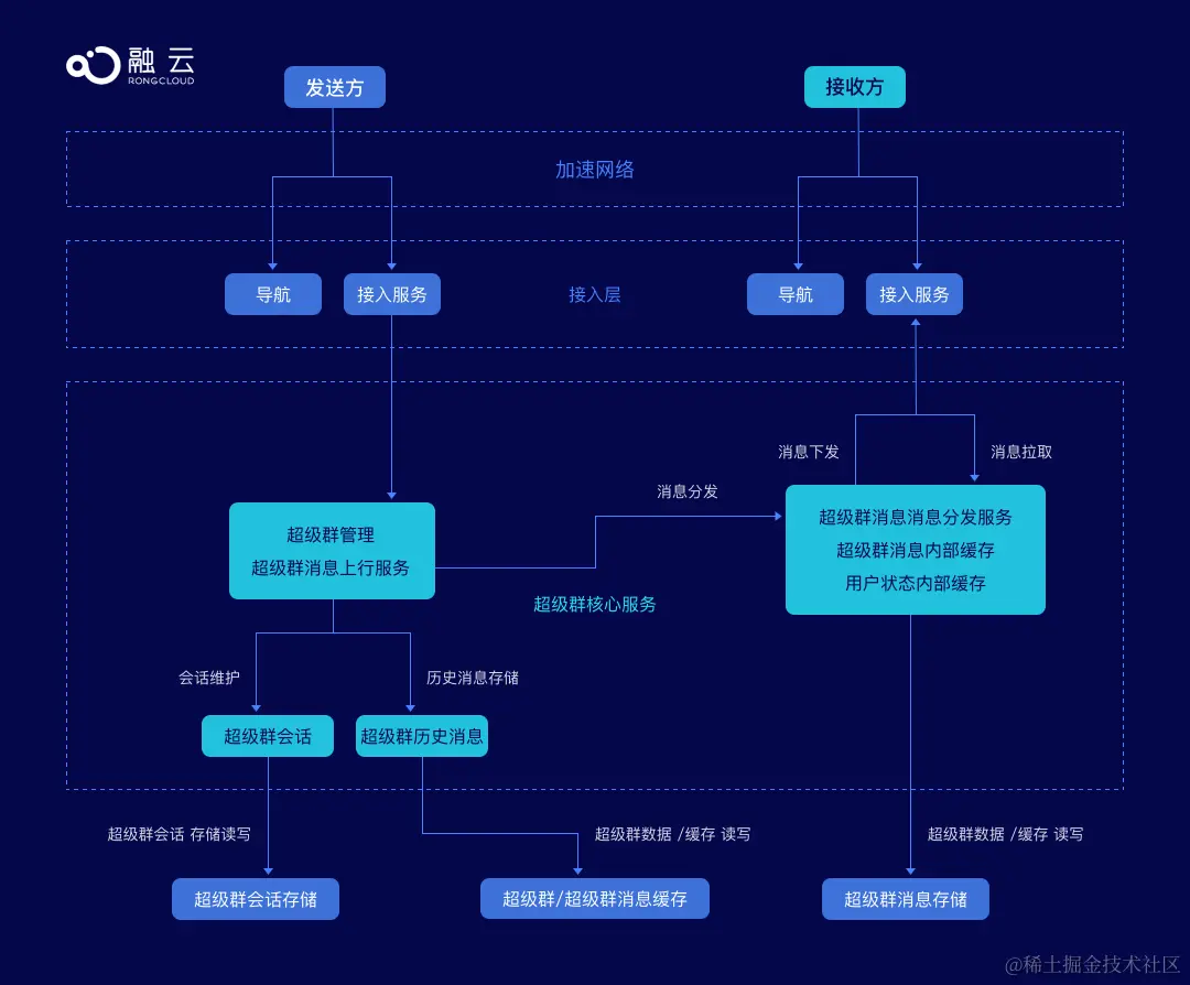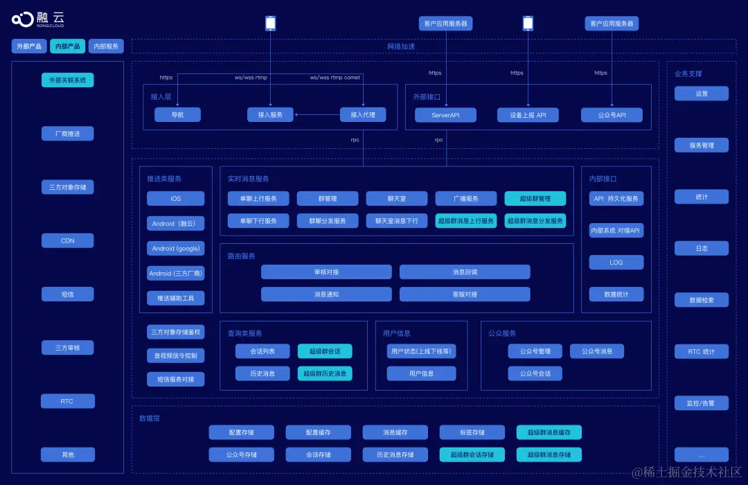 如果要解读融云超级群所依赖的 IM 基础能力,恐怕一本迷你书也写不完,其粗略架构图如下: