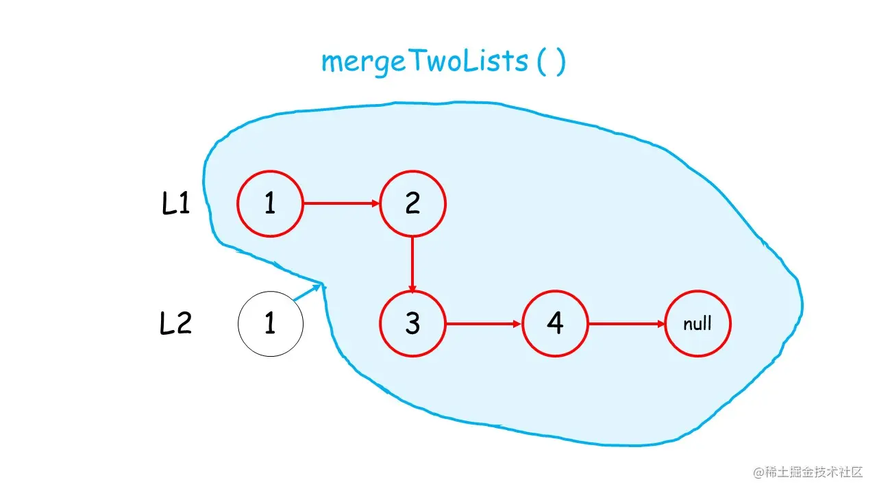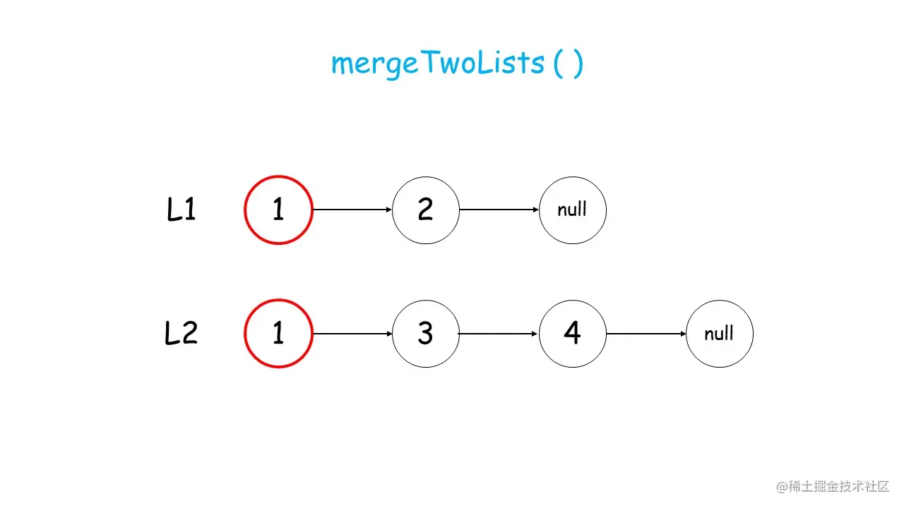 如何递归?我们直接判断 l1 和 l2 头结点哪个更小,然后较小结点的 next 指针指向其余结点的合并结果。也就是说,两个链表头部值较小的一个节点与剩下元素的 merge 操作结果合并即可。