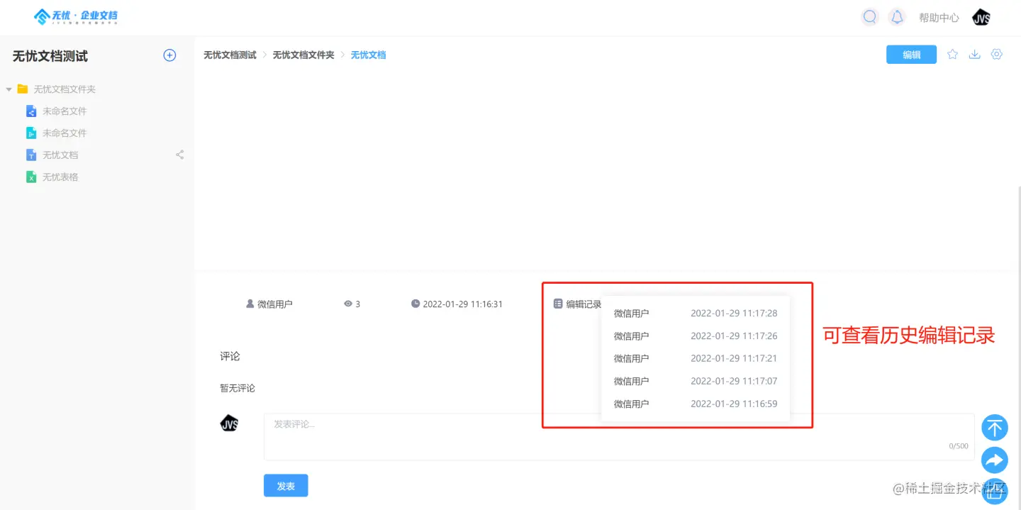 第四步,查看历史编辑管理消息。新成员优先查看这些消息,以便快速找到重点,跟上团队节奏。在无忧·企业文档可以自由浏览历史记录,方便新人迅速了解团队交流模式与习惯,更好地融入团队。职场新人,破冰成功,马上投入工作吧。