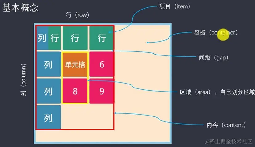容器container: 元素设置display:grid转化为grid布局,里面的子元素为item;