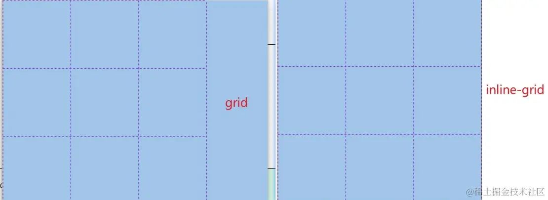 display:inline-grid 设置为行内元素grid布局,不独占一行; grid 设置行内块元素grid布局,独占一行;
