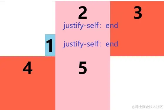 连写:place-self: end start; => 第一个值:align-items 第二个值:justify-items;