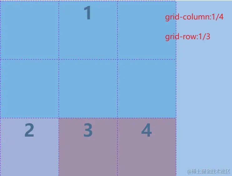 连写:grid-column/row => 简写格式:用/分割,grid-column:1/4