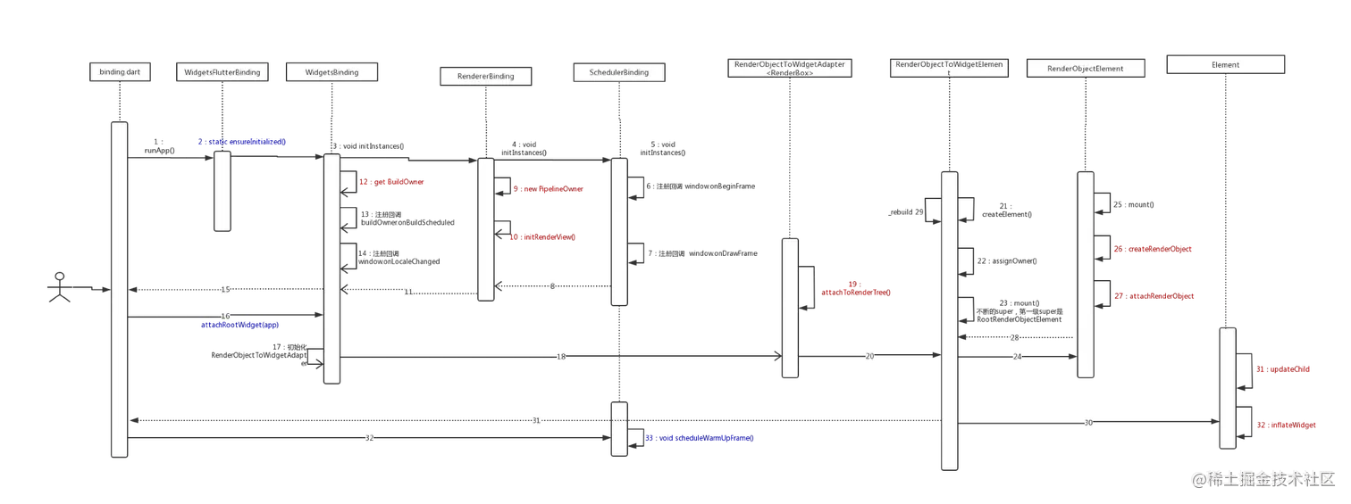 WidgetsBinding 覆盖了前面的 binding 的 initInstances(),所以 WidgetsBinding 的 initInstances() 会首先被调用,而 WidgetsBinding 的 initInstances 函数中先通过 super 向上调用 initInstances ,根据mixin的特性 执行顺序: initInstances 的执行顺序依次是:BindingBase -> GestureBinding -> SchedulerBinding -> ServicesBinding -> PaintingBinding -> SemanticsBinding -> RendererBinding -> WidgetsBinding,从而依次完成各个 Binding 的初始化相关工作。