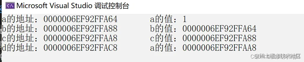 cout << "d的地址:" << &d << "\t" << "a的值:" << d << endl;