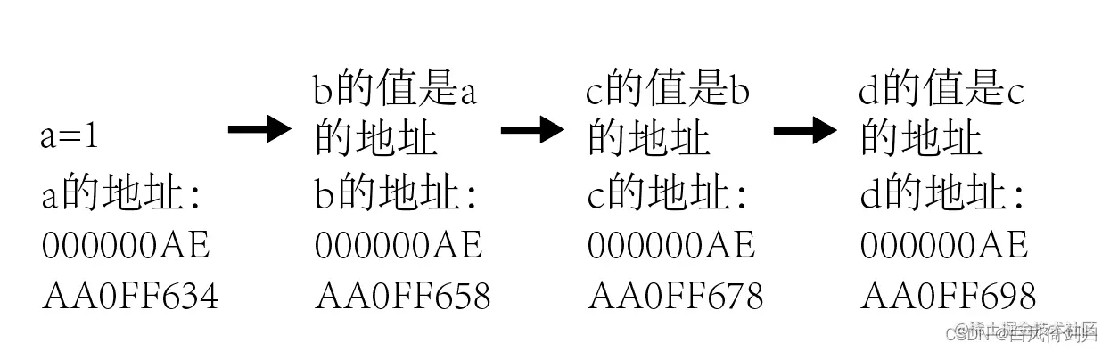 2.二级指针c的地址是一级指针b的地址,而c的地址是二级指针c自己的地址