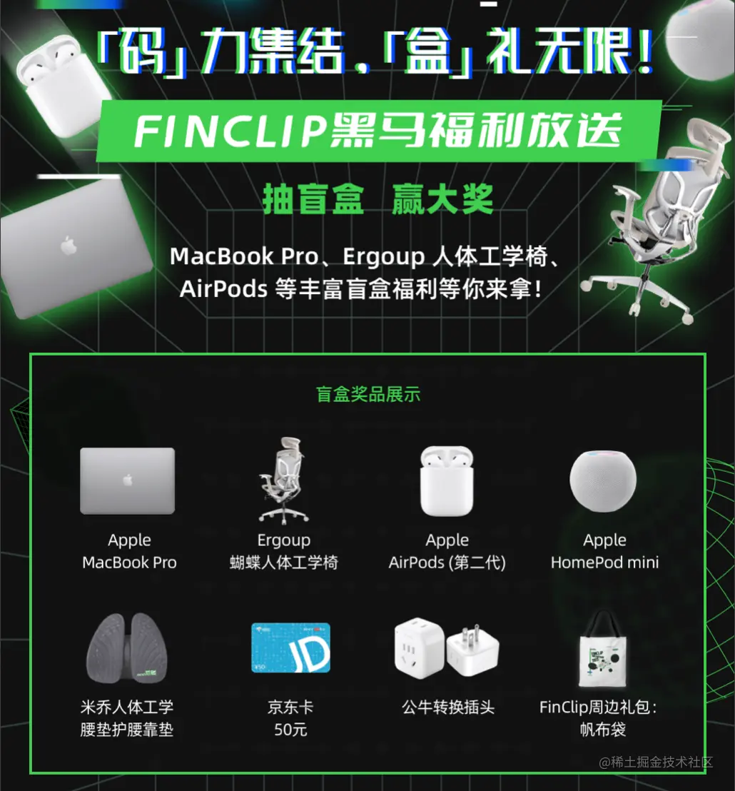 除了赛事奖金之外,主办方还为吃瓜群众们准备了盲盒抽奖活动。只要你参与赛事海报分享、为支持的战队打call、体验FinClip 平台均可参与盲盒抽奖。Mac pro、人体工学椅、苹果音响等海量礼品等你抱回家!