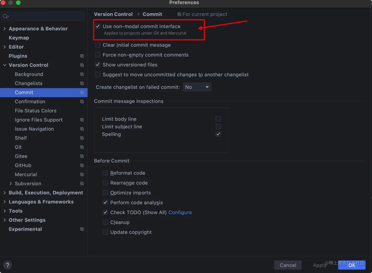 AS 设置 commit 为侧边栏或对话框 云端上的猫 2022-03-02 1,343 阅读1分钟 打开设置界面 Settings/Preferences -> Version Control -> Commit 如图标注的部分,勾选就可以在侧边栏。取消就是对话框。 ● 勾选后效果 ● 取消勾选效果