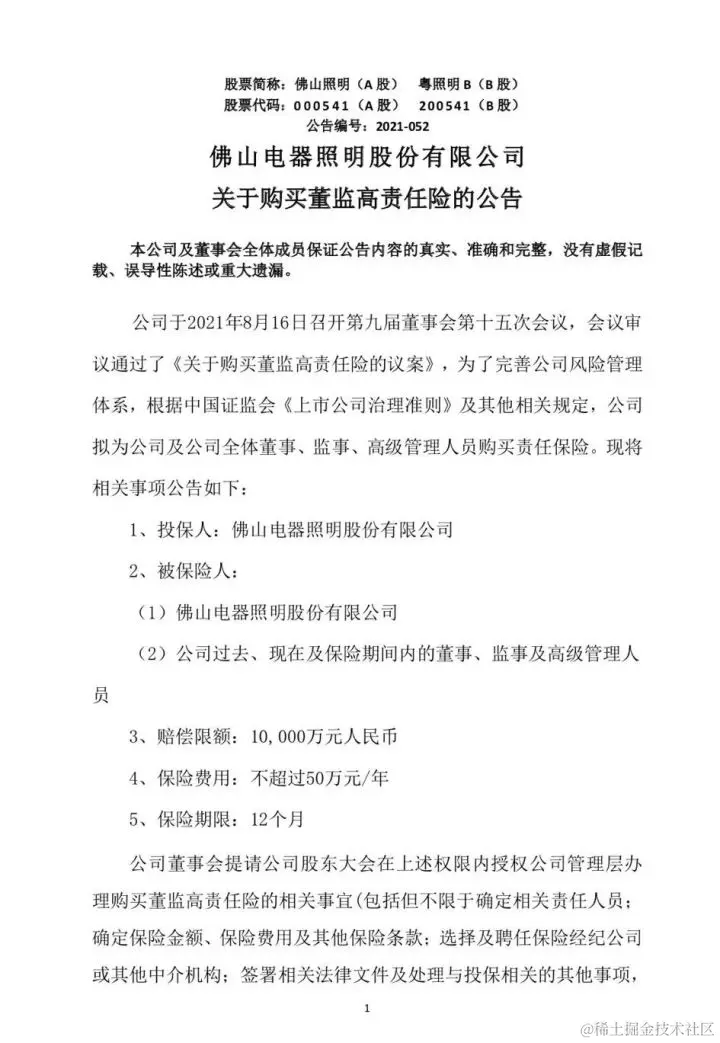 2021年8月16日,佛山电器照明股份有限公司发布了关于购买董监高责任险的公告:为了完善公司风险管理体系,根据中国证监会《上市公司治理准则》及其他相关规定,公司拟为公司及公司全体董事、监事、高级管理人员购买责任保险。8月20日,乐山电力股份有限公司也发布了关于为公司及董监高购买责任险的公告。