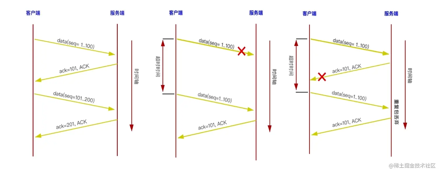 当客户端向服务端发送的包丢失或者服务端返回的ack丢失, 在客户端等待超时后都认为是丢包了, 就会重新发包重传.