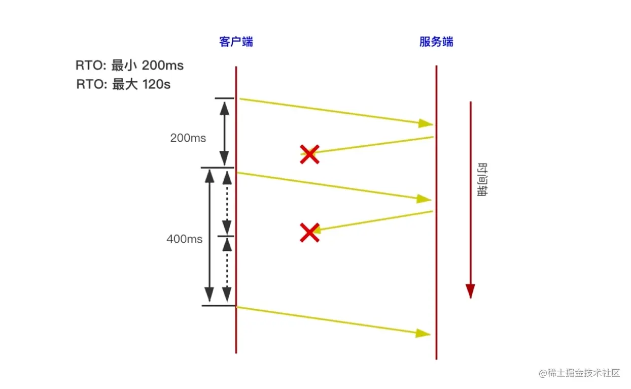 上图为TCP重连超时的退避机制: 为了避免重传导致网络拥塞和抖动, 每次重传后超时时长都会增加.