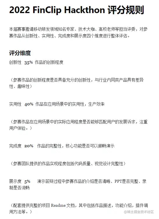 不能违反的规则这一点不用过多强调,大家一起参赛,追求的也是公平竞争。如果有些规则是组委会明确说明不能违反的,那就必须严格遵守。至于评分规则,可以说是合理利用规则来「投其所好」。在时间和精力有限的情况下,是否了解评分规则,会直接影响到整个团队在整个过程中的时间和精力分配。一般评分规则会包括与主题的匹配度、完成度、产品展示、商业价值、应用前景,创新价值等方面,这就要求参赛者清楚地知道该在哪些环节进行重点投入。还是拿FinClip Hackathon举例子来说,「应用前景」占到了很高的比重,跟「创新性」相当。所有考虑到一定是团队资源和时间宽裕的前提下,我们应该选择在应用前景或者创新价值投入了更多的精力。这样符合比赛的评分机制,才能更好的从众多的作品中脱颖而出。