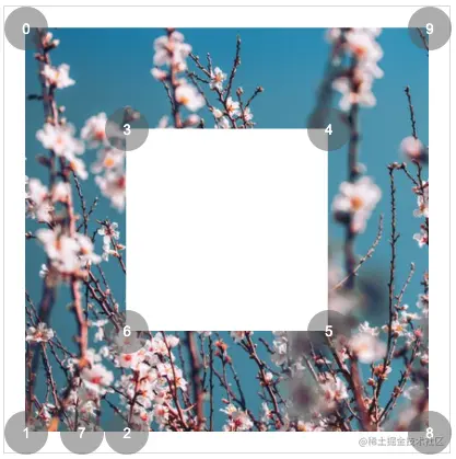 这里有必要讲解一下,使用 clip-path 切割一个环形图案,是可以做到的。假设,我们需要一个正方形环形,其点顺序如下: