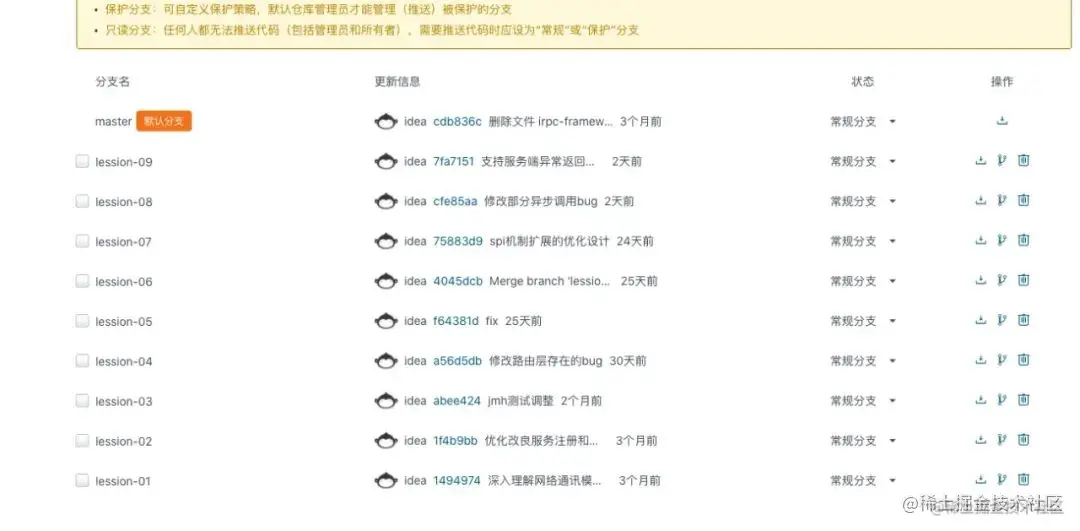 不同分支的代码只需要微调下自己的配置文件,基本可以保证运行正常,随着课程的递增,你会看到越靠后的分支的代码结构和复杂度也在递增,这正好对应了该RPC框架在日渐完善中的变化。