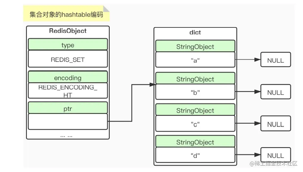 底层字典作为底层实现,每个键都是一个字符串对象,每个字符串对象包含了一个集合元素,而字典的值则全部被设置为NULL。