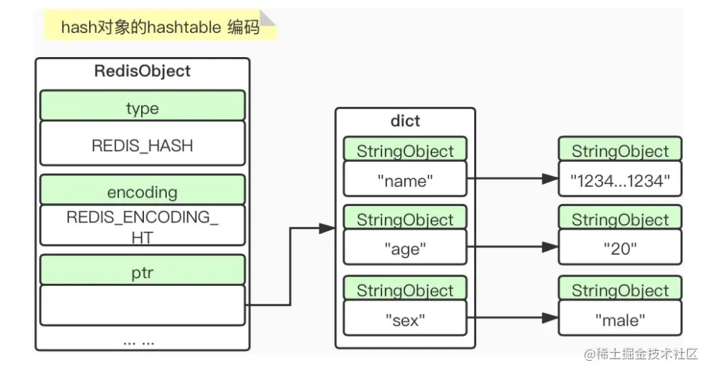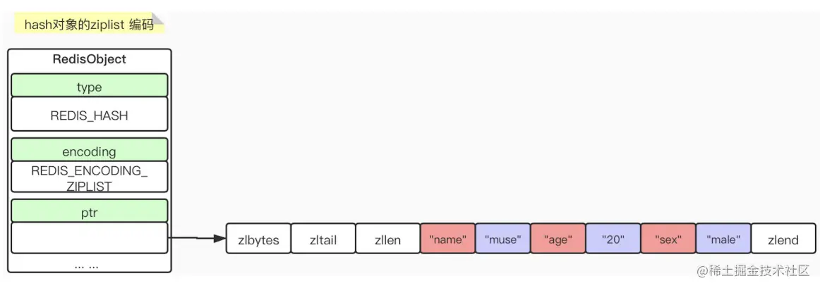 127.0.0.1:6379> hset hello name wanji (integer) 1 127.0.0.1:6379> hset hello age 20 (integer) 1 127.0.0.1:6379> hset hello sex male (integer) 1 127.0.0.1:6379> hgetall hello 1) "name" 2) "wanji" 3) "age" 4) "20" 5) "sex" 6) "male" 127.0.0.1:6379> OBJECT encoding hello "ziplist"数据结构如下: