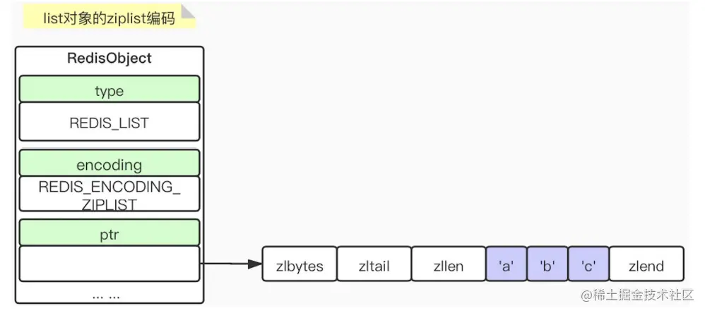 ziplist 编码列表对象,采用压缩列表实现。每个列表节点保存一个列表中的元素。
