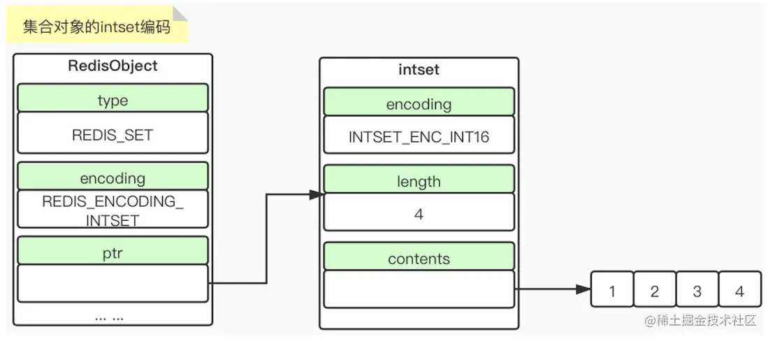 127.0.0.1:6379> SADD number 1 2 3 4 (integer) 4 127.0.0.1:6379> OBJECT encoding number "intset"数据结构如下: