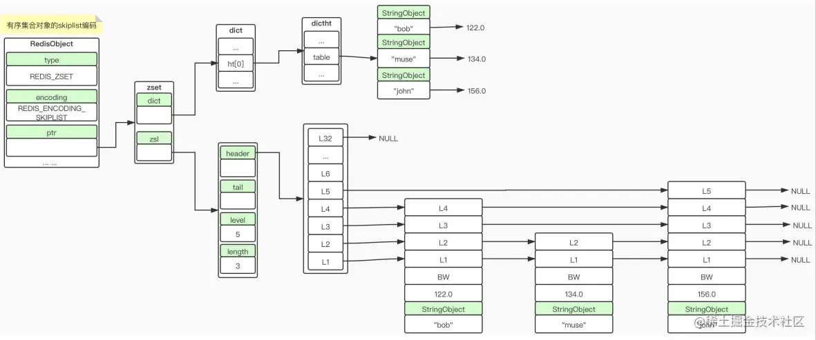 skiplist编码的有序集合采用zset结构作为底层实现,一个zset同时包含一个字典和一个跳跃表。