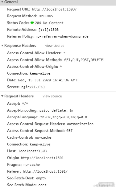 下图是一个预检请求的请求报文和响应报文。因为添加了不属于上述简单请求的头部字段,所以浏览器在请求头部添加了 Access-Control-Request-Headers 字段,值为跨域请求添加的请求头部字authorization。