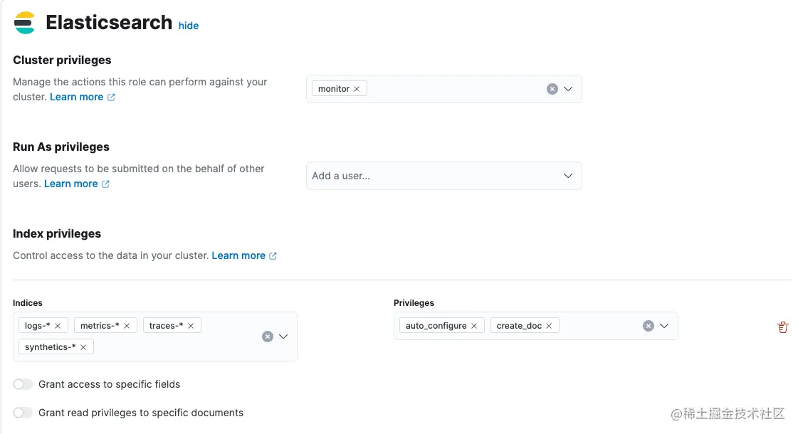 logs-*-*,metrics-*-*, nginx-*-*,traces-*-*andsynthetics-*-* - 在 Privileges 项中 填入 auto_configure 及 create_doc