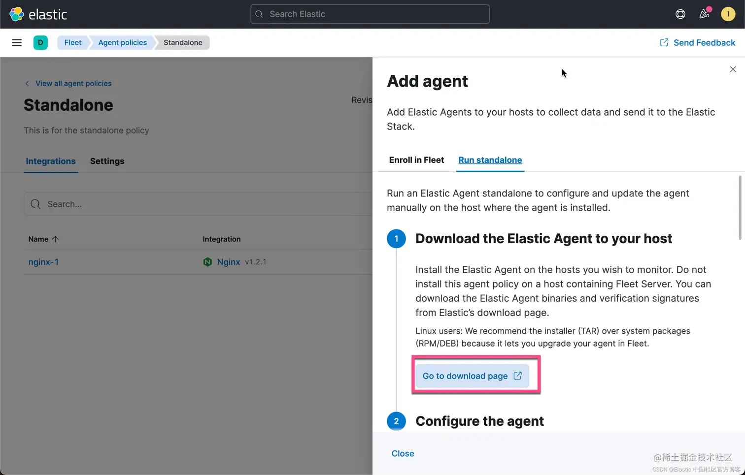 上面的 Go to download page 就是我们在上面安装一节中显示下载 Elastic Agent 的页面。我们接着向下滚动: