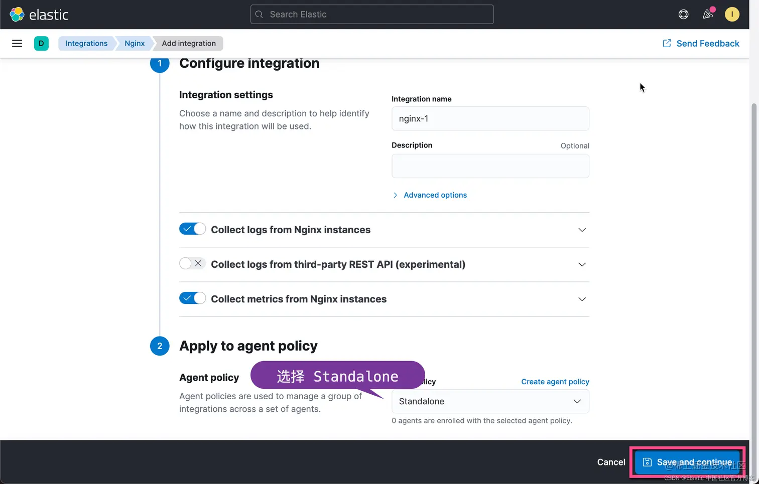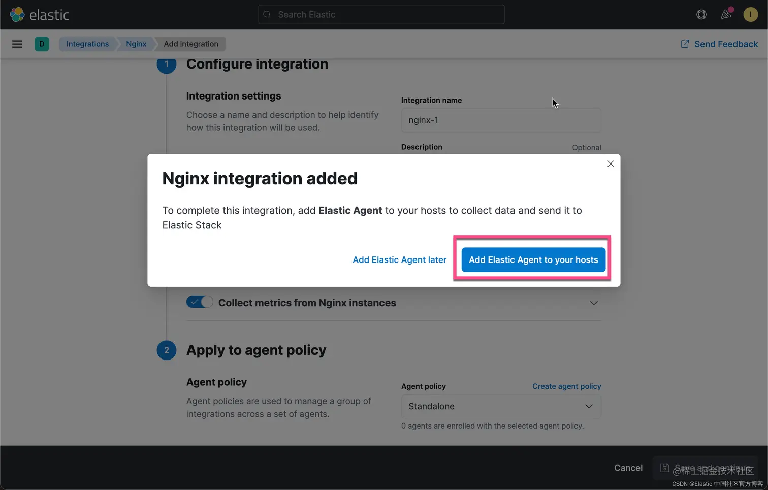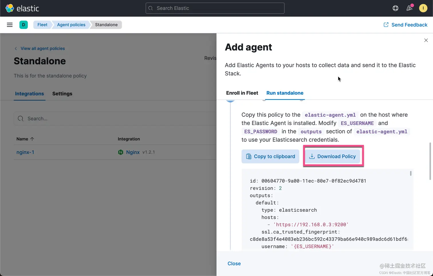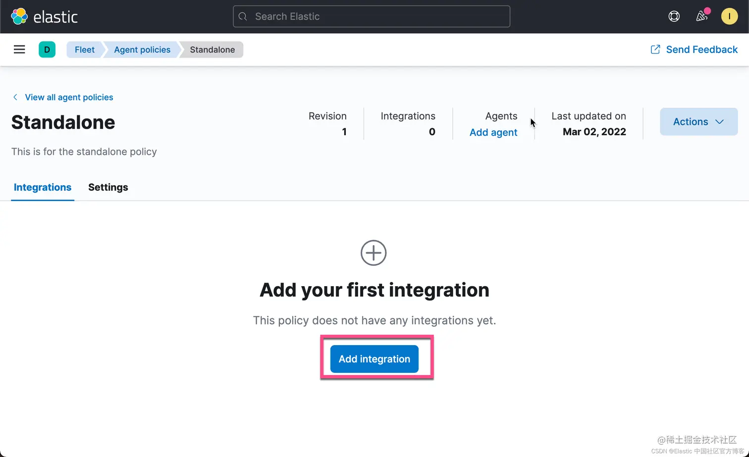 要快速入门,请使用 Kibana 将集成添加到代理策略,然后下载该策略以用作独立 Elastic Agent 策略的起点。 这种方法可以节省时间,不易出错,并使用大量手动添加繁琐的细节来填充策略。 此外,在启动 Elastic Agent 之前,在 Kibana 中添加集成会加载所需的资源,例如索引模板和摄取管道。