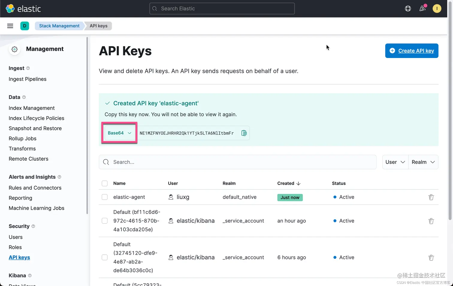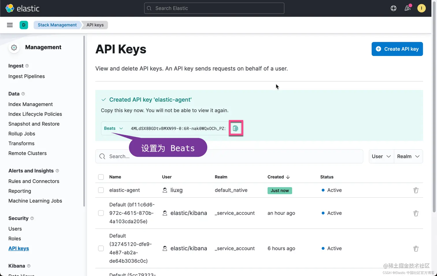 你将看到一条消息,指示该密钥已创建,以及已编码的密钥。 默认情况下,API 密钥是 Base64 编码的,但这不适用于 Elastic Agent。 点击上面的选择框,把 Base64 修改为 Beats: