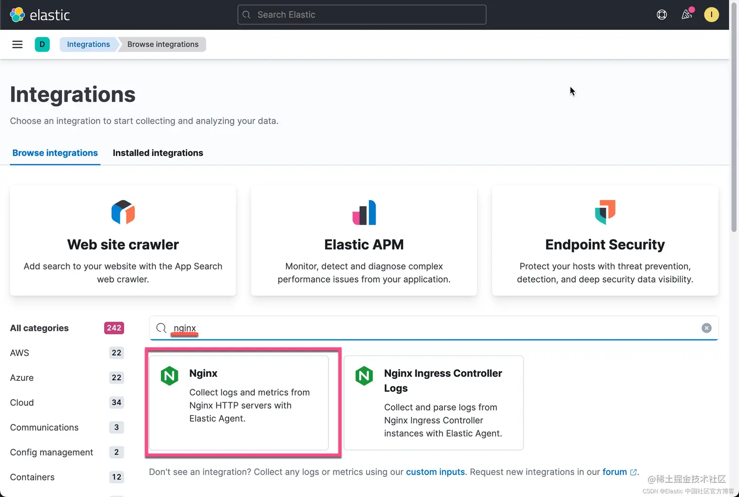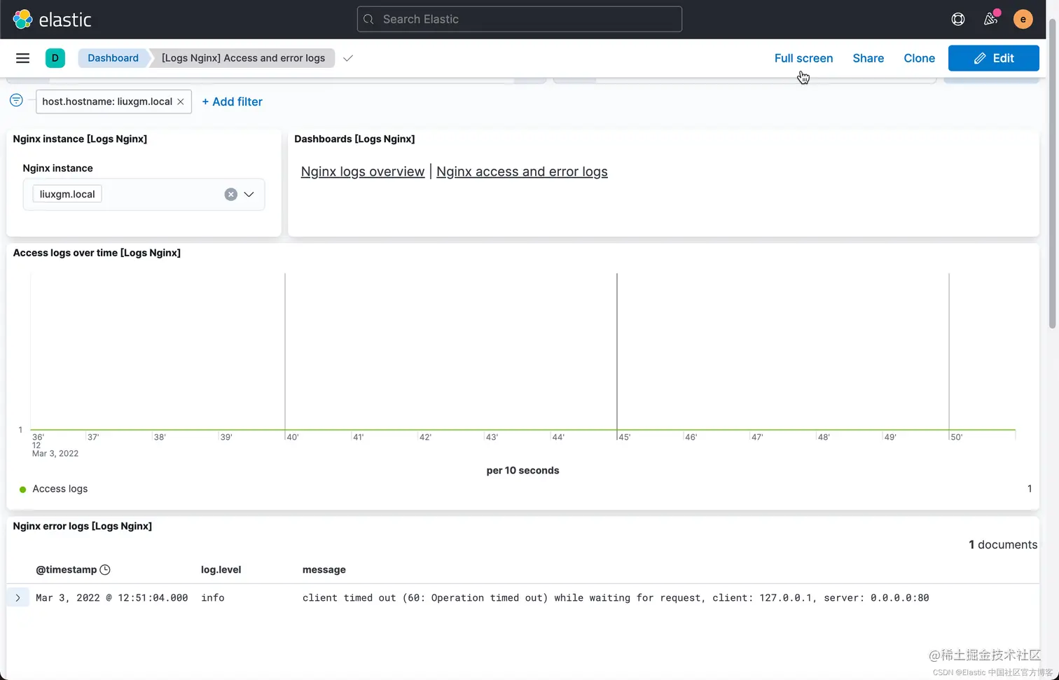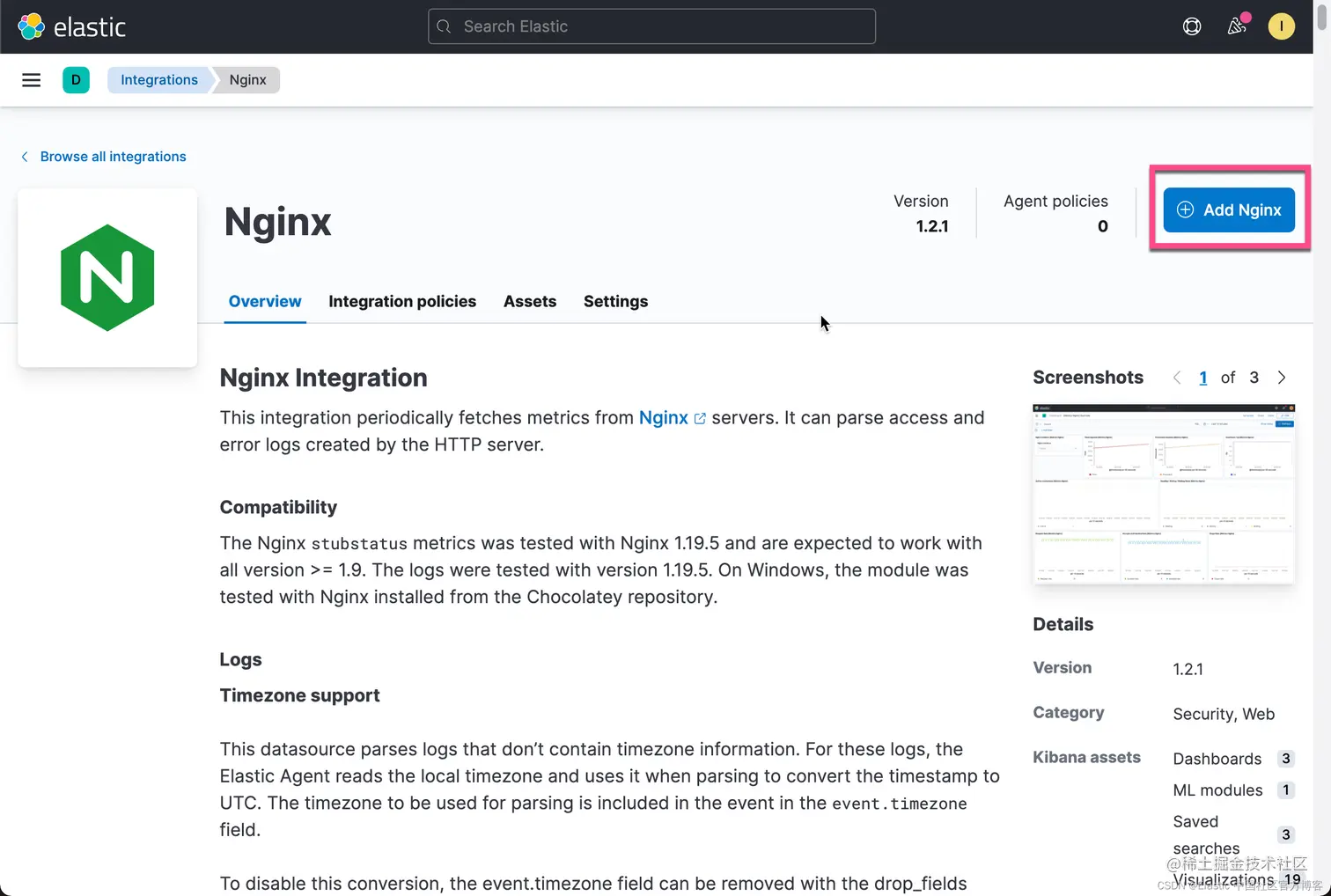 从上面,我们可以看到 host.access.log 及 error.log 这两个文件。接下来我们将使用这些信息来配置 Nginx 的 integration。点击上面图中的 Add Nginx:
