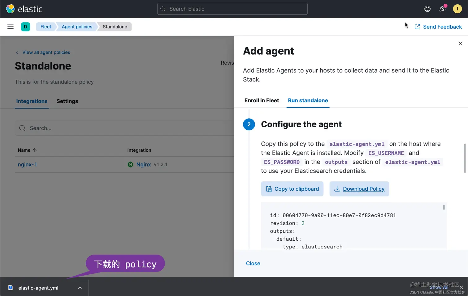 上面显示下载的 policy。它的名字和之前 Elastic Agent 安装目录中一个配置文件 elastic-agent.yml 是一样的。我们把上面的 elastic-agent.yml 文件拷贝到 Elastic Agent 的安装目录中,并覆盖在 Elastic Agent 安装目录中原有的 elastic-agent.yml 文件: