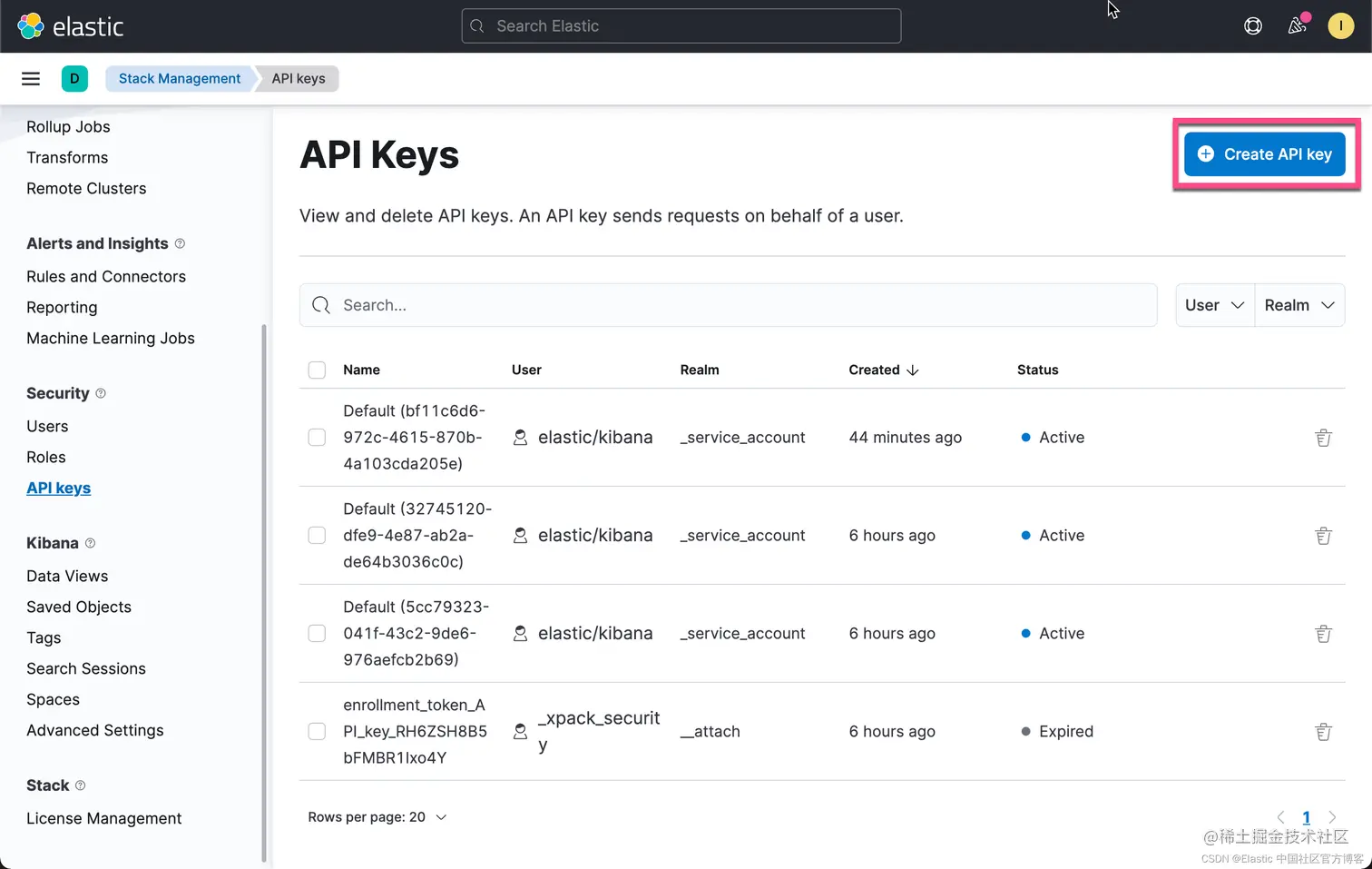 你可以将 API 密钥设置为在特定时间过期,并且可以显式地使它们失效。 任何具有 manage_api_key 或 manage_own_api_key 集群权限的用户都可以创建 API 密钥。