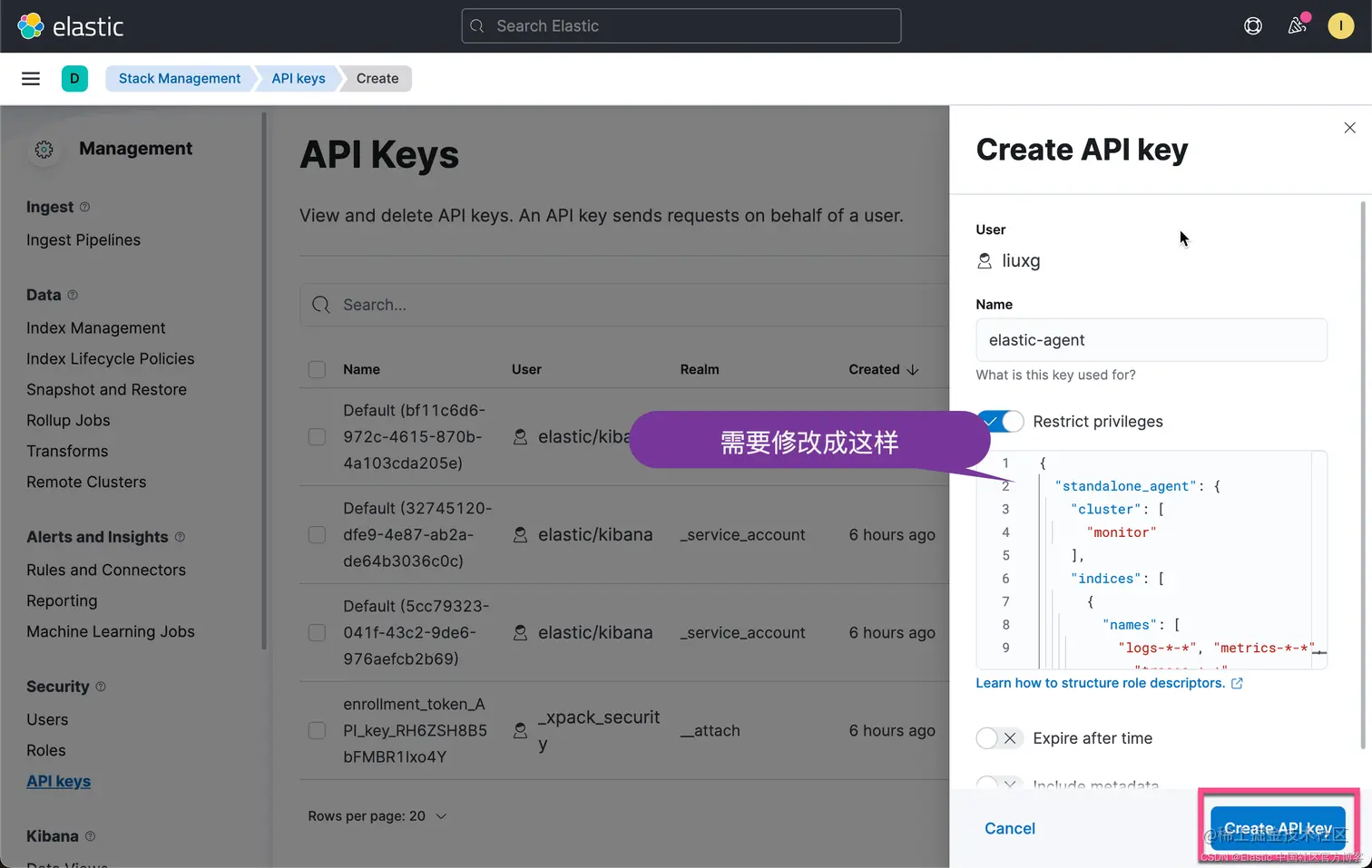要为 Elastic Agent 创建 API 密钥: