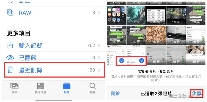 打开手机相册,拉到手机最底部,点击 “最近删除” ,跳转到新页面可以看到最近40天内删除的照片,再从中去选择需要恢复的照片。