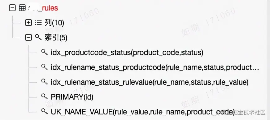 除了时间、操作人字段,XXX_rules表就rule_name、rule_value、status、product_code四个字段,表的索引对这四个字段做各种排列组合。存在如下问题: