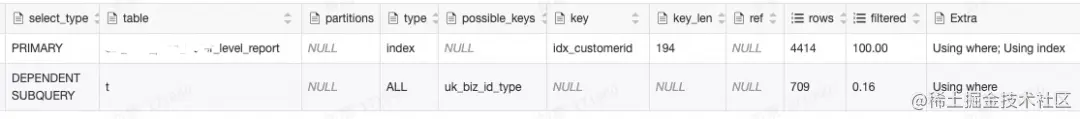 上述查询语句第8行,customer_id为XXX_level_report表字段,未命中XXX_white_list表索引,导致索引失效。