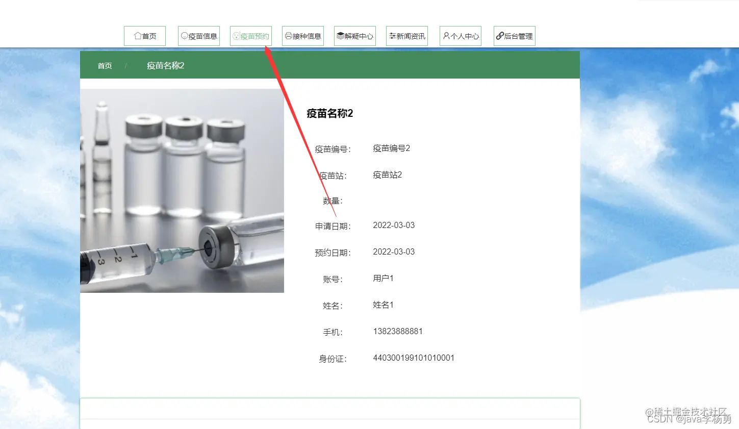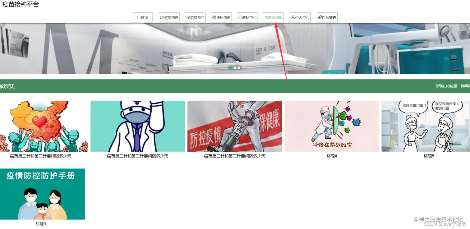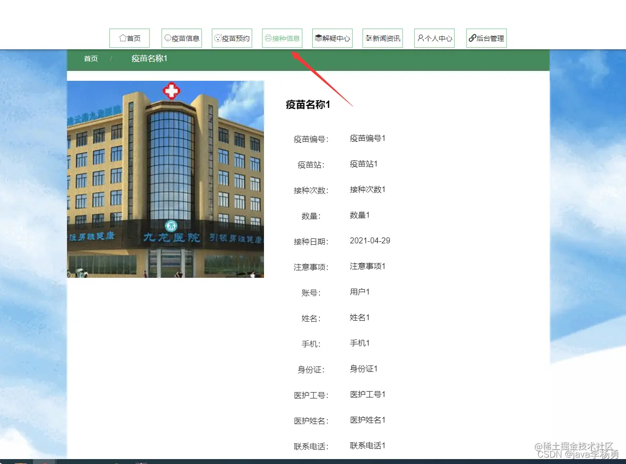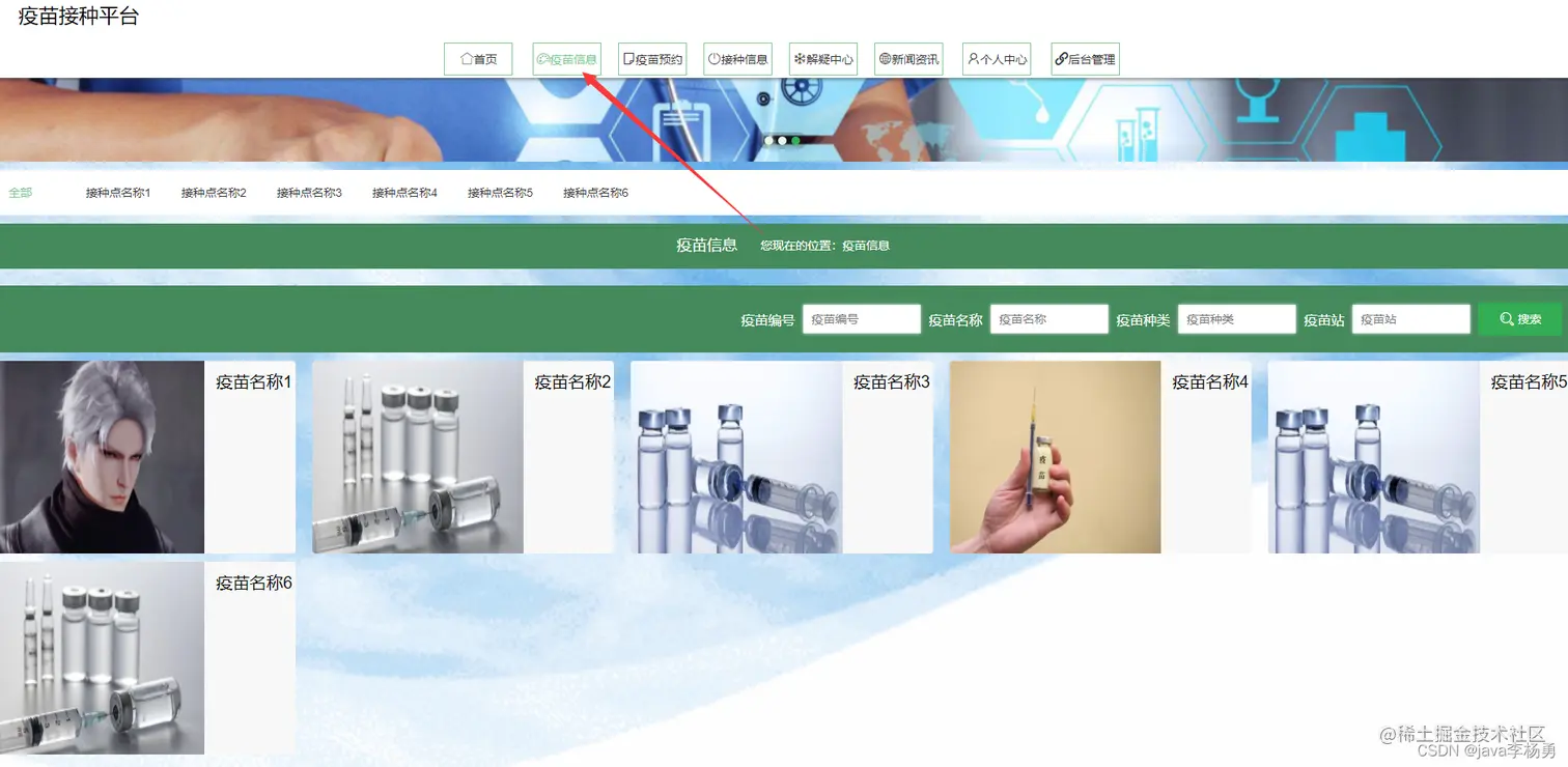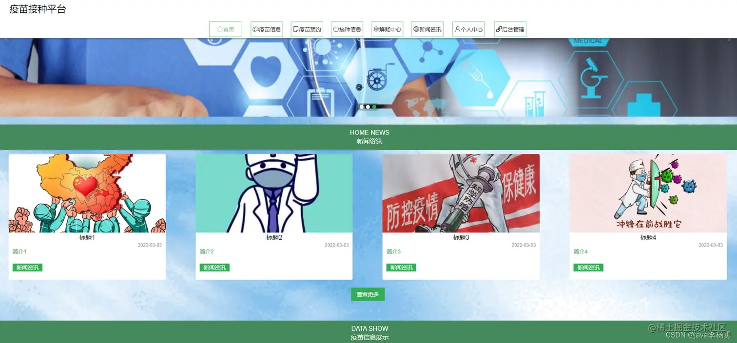 系统首页:平台首页可以查看首页、疫苗信息、疫苗预约、接种信息、解疑中心、新闻资讯、个人中心、后台管理等