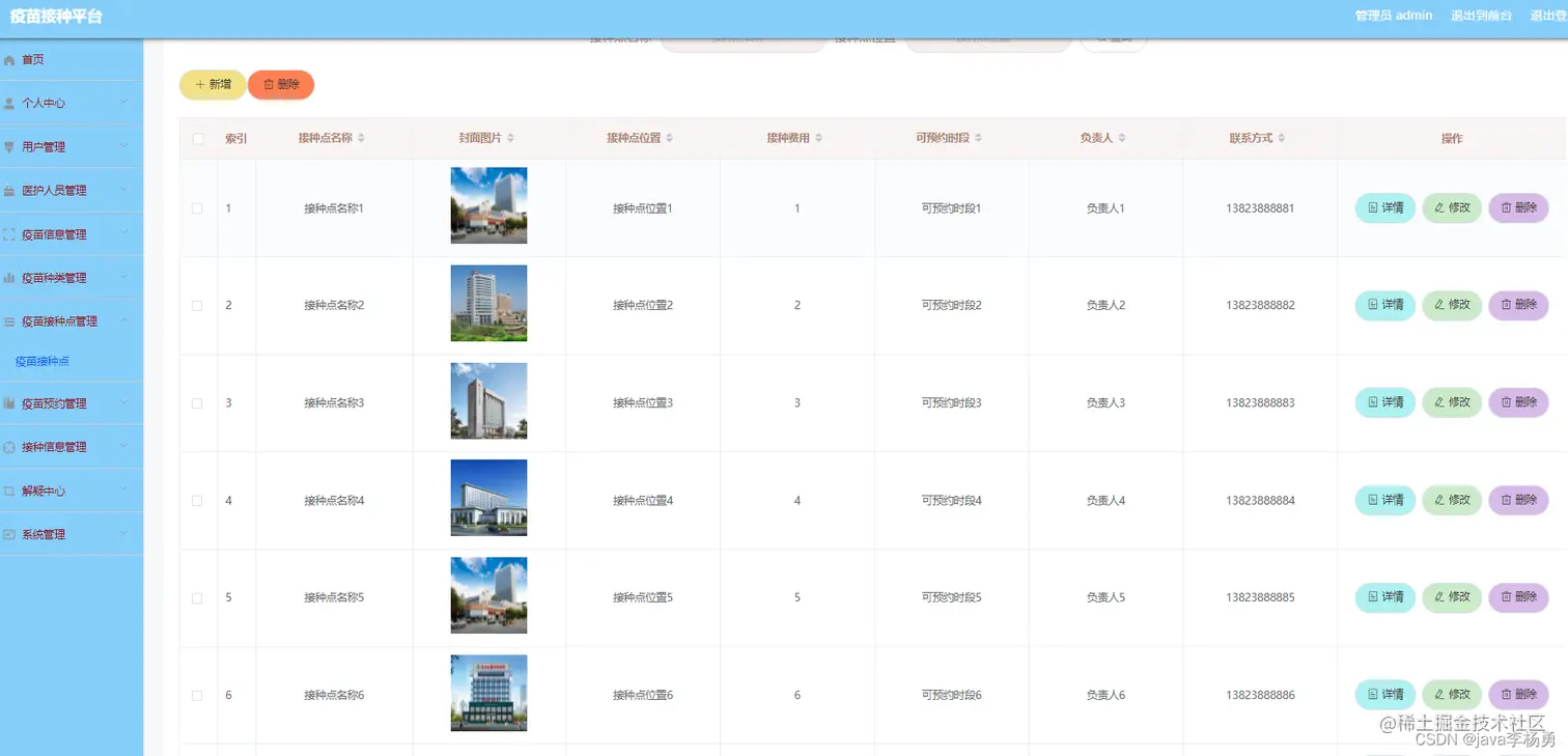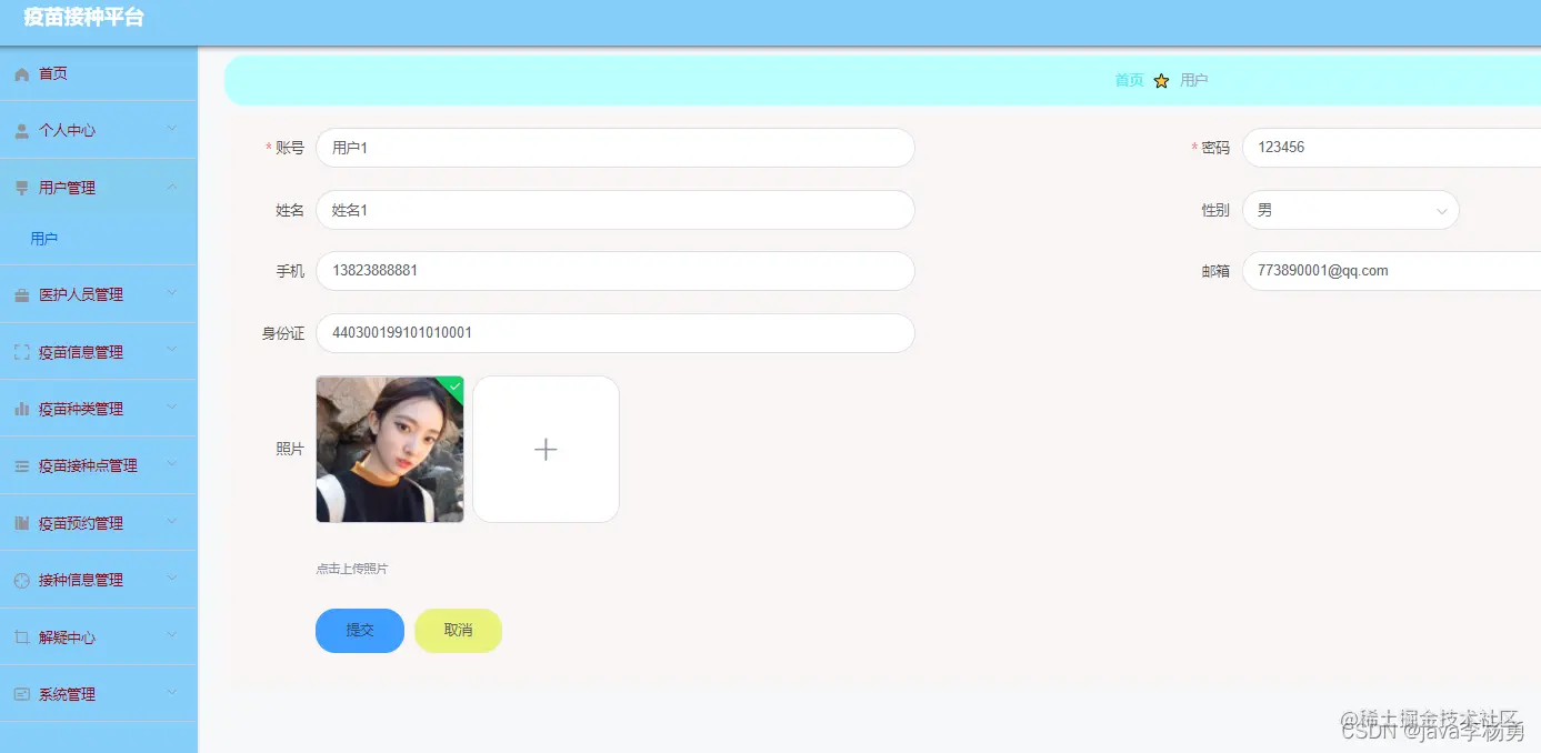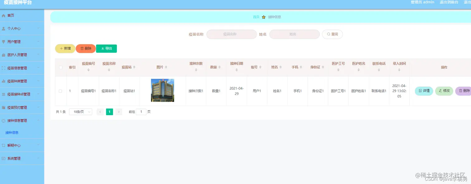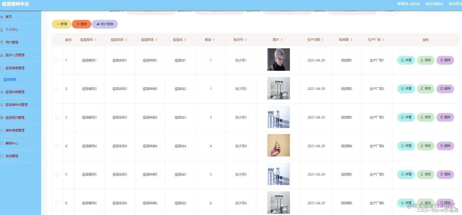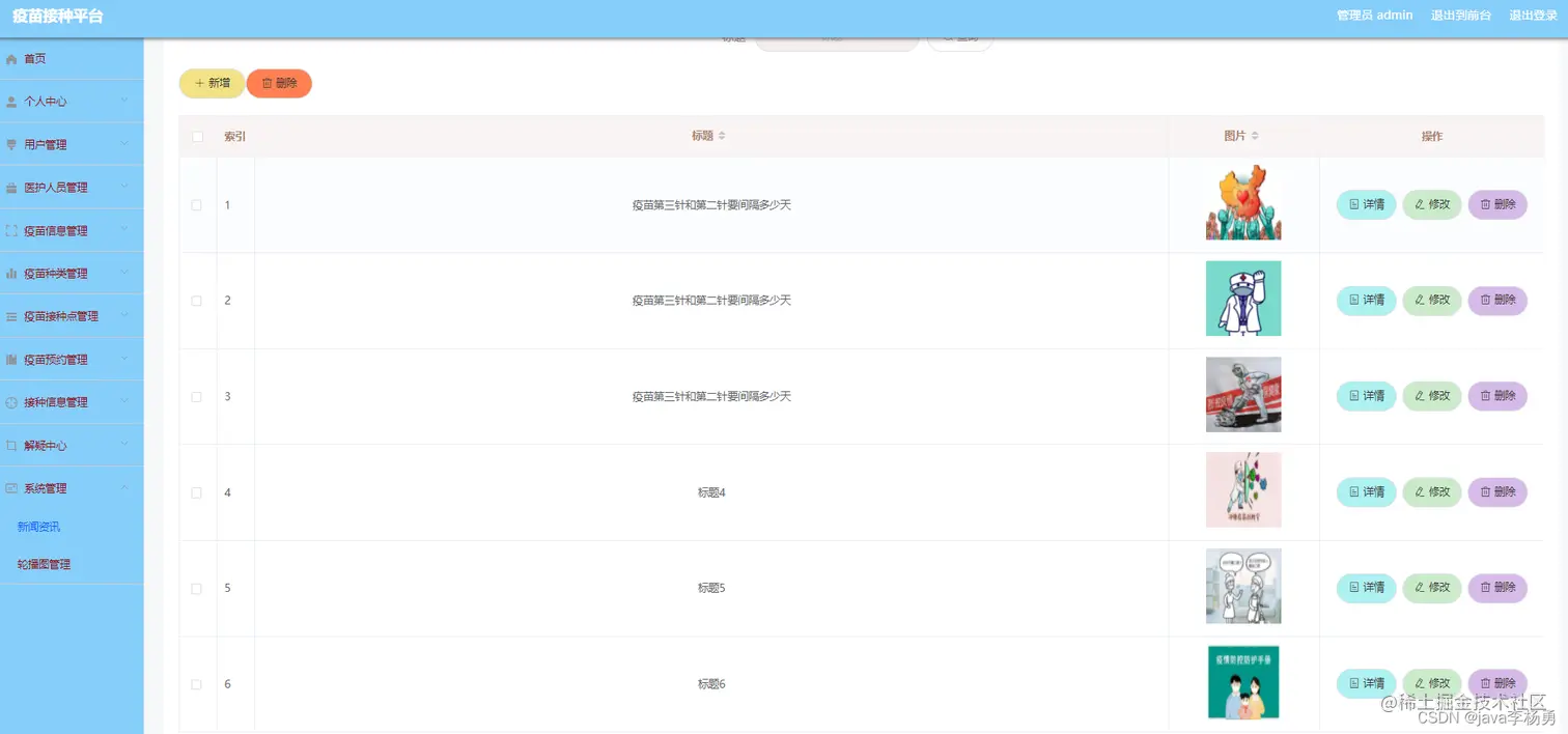 系统首页:平台首页可以查看首页、疫苗信息、疫苗预约、接种信息、解疑中心、新闻资讯、个人中心、后台管理等