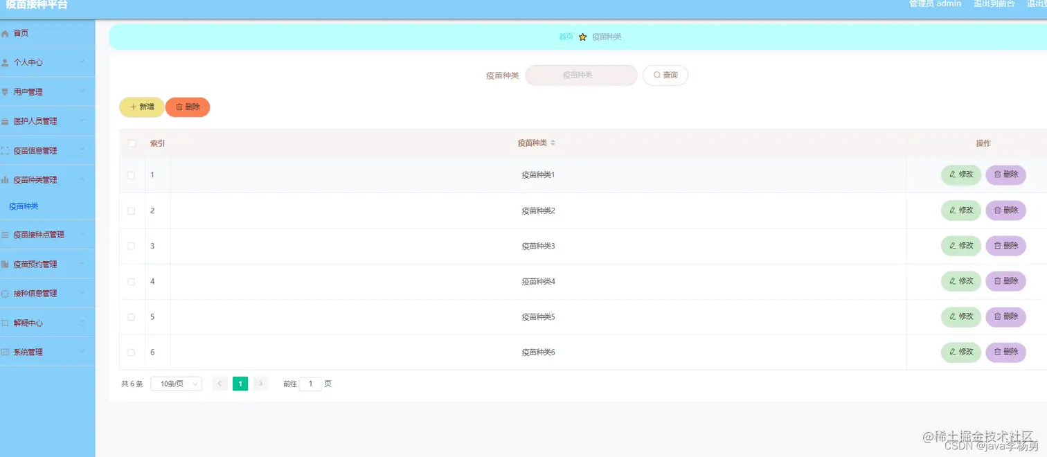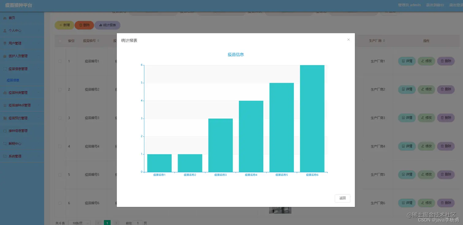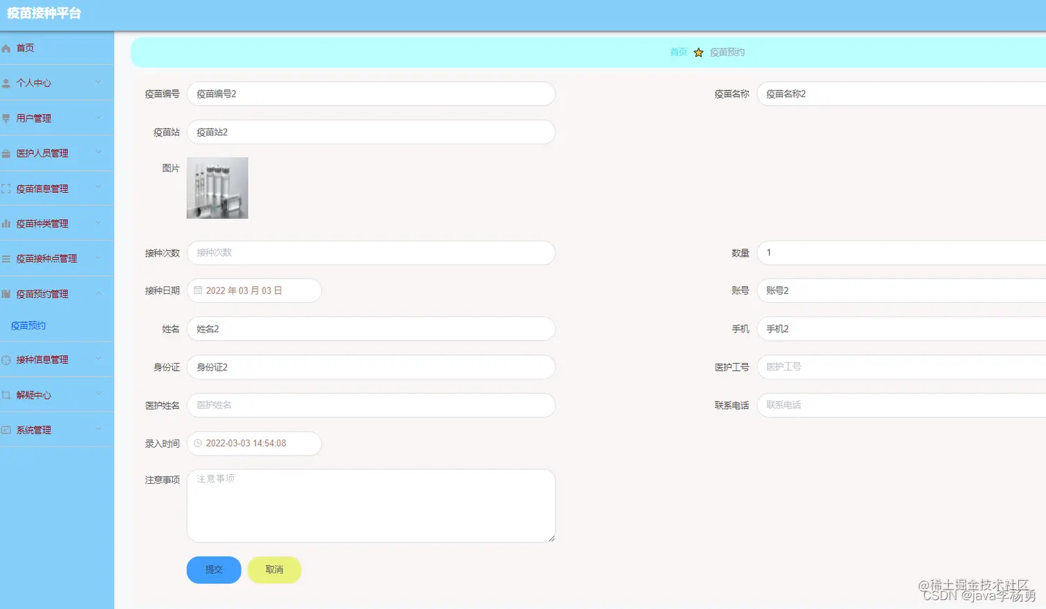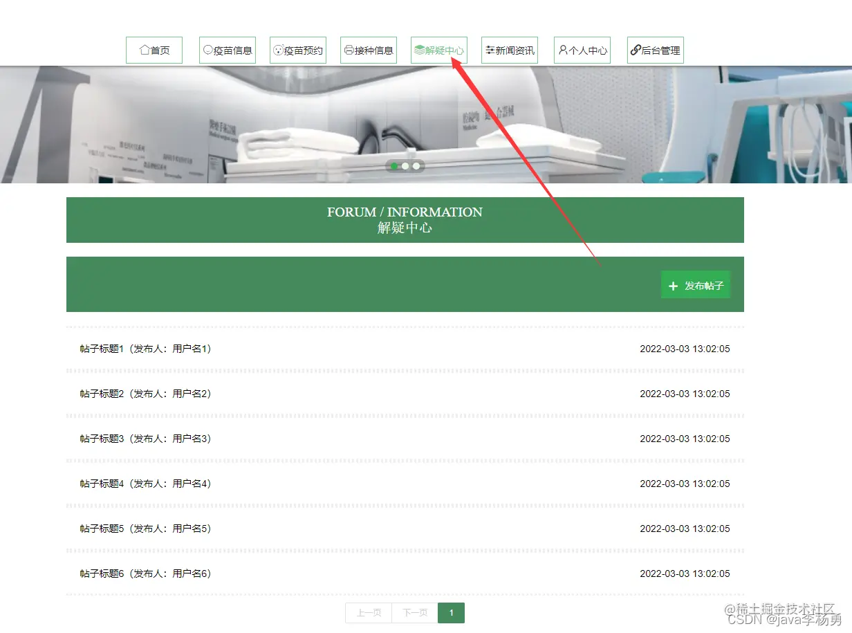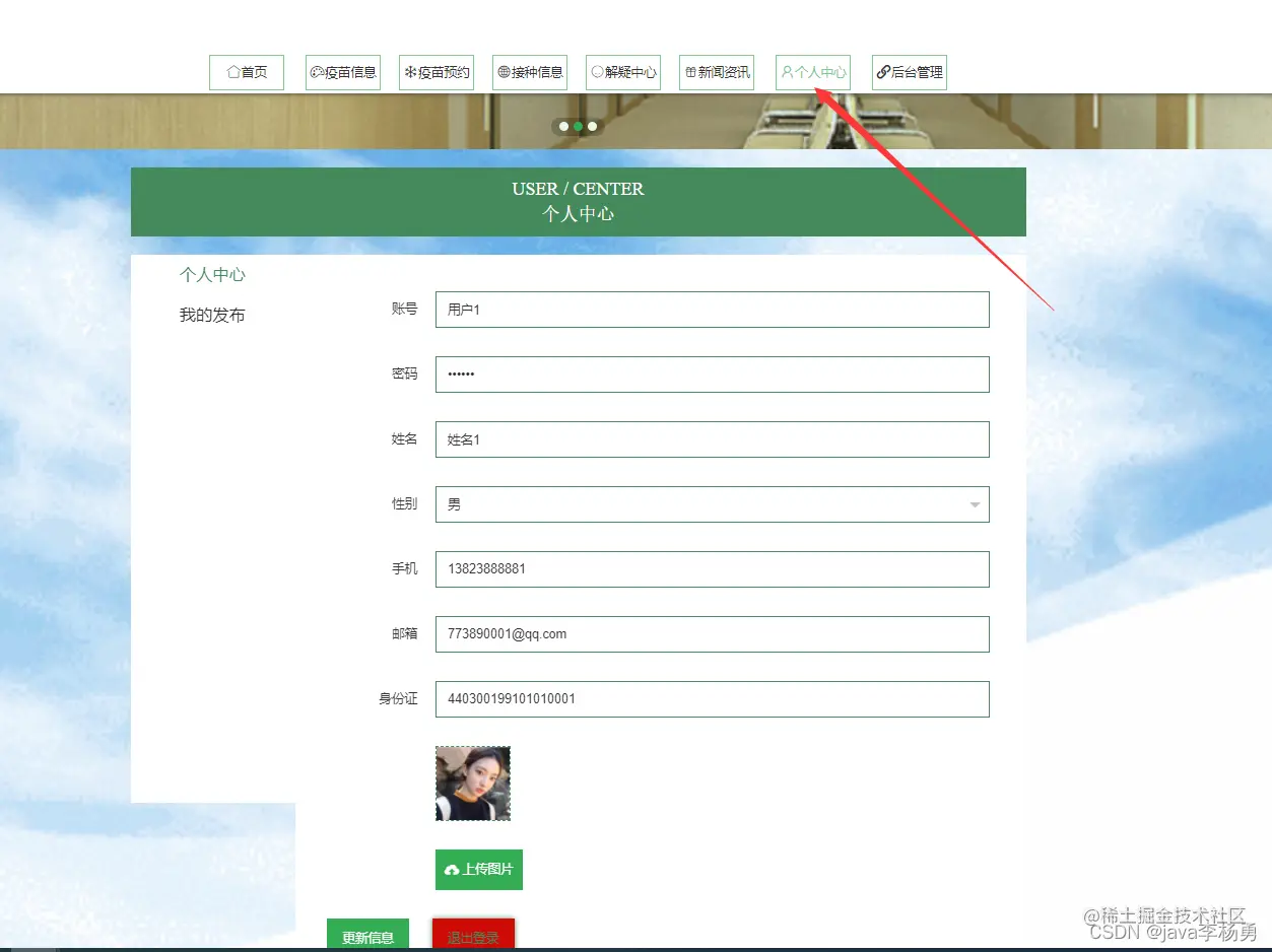 系统首页:平台首页可以查看首页、疫苗信息、疫苗预约、接种信息、解疑中心、新闻资讯、个人中心、后台管理等