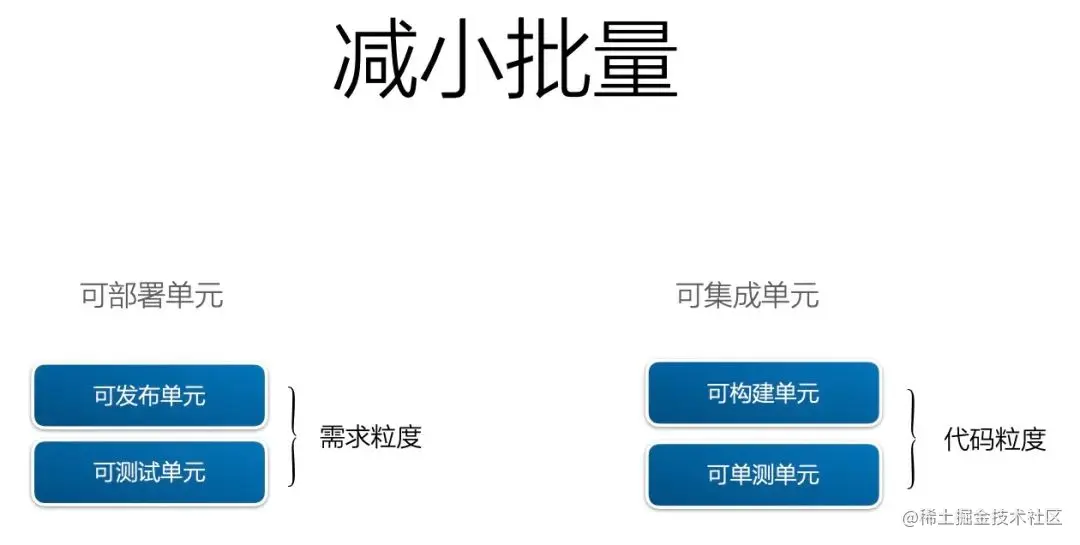 第一,减小批量,刚刚我们已经提到从需求的粒度和代码的粒度,需要可发布单元,可测试单元尽可能地少,可构建单元,可单测单元代码粒度尽可能的小。