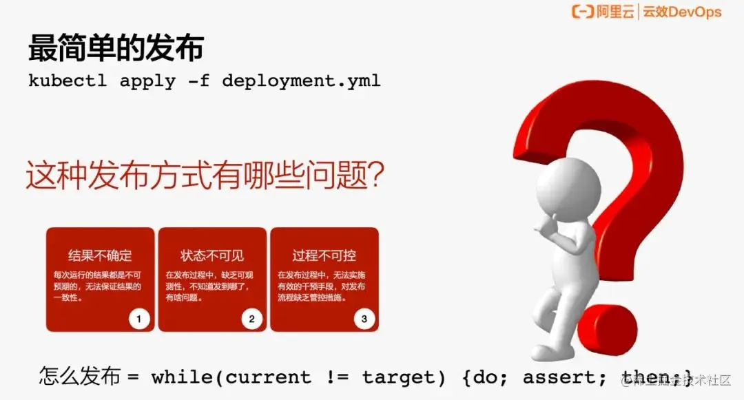 第一,结果不确定。kubectl之后pod可能并没有起来,deployment可能是不能用的,服务可能有失败,发布之后可能会遇到pod不够,资源没有,这些都是未知的。所以发布是否成功,发布成功了多少都不确定,这是不可预期的。