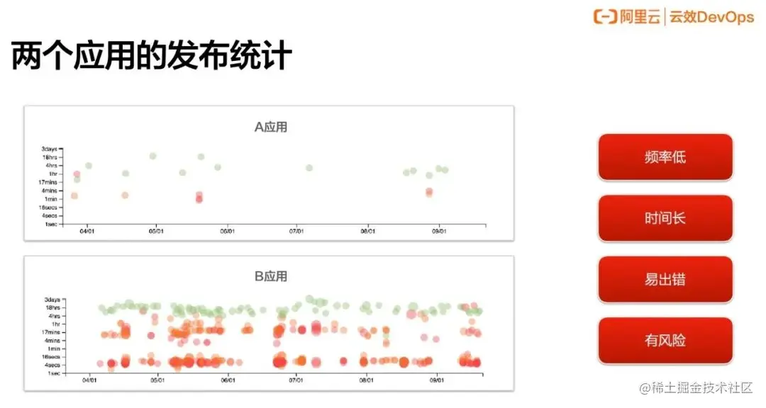 从这两张图里面看,我们发现A应用发布频率很低,很长时间才发一次,另外B应用里面很多发布失败,确实有相应的一些风险,比如说时间很长,又很容易出错的话,就很难做到按需发布。