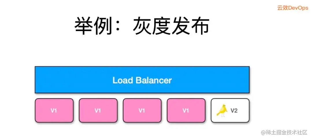 灰度发布常见的架构如上。首先有一个负载均衡,负载均衡下面的服务版本当前是V1,要发布新的版本是V2,可以从里面摘一个节点,五分之一的流量用V2。
