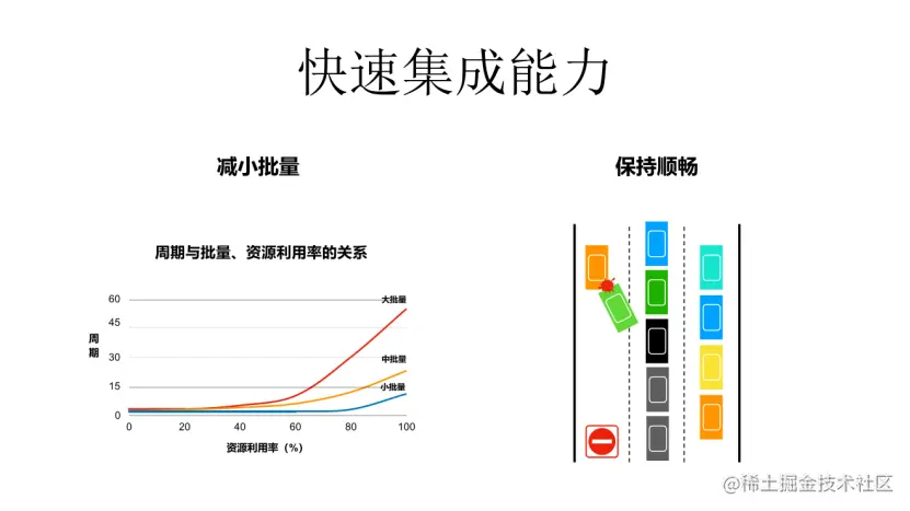快速集成的手段包括减小批量和保持顺畅。因为集成的粒度和资源利用率以及周期时间是有相关性的,小批量周期时间比较短,大批量周期时间一般来说比较长,资源利用率相对来说比较接近,不会有太大的问题,所以通过减小批量可以让周期时间尽可能地变短,变短之后频率就会提高,频率多反馈又快,对于应用的修复或者相应的问题响应就会变的更快。第二,保持顺畅。把里面的问题解决掉之后,才能让这条道顺畅起来。