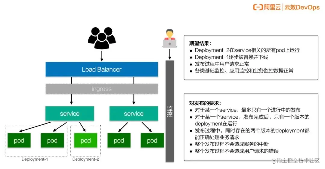 我们期望deployment2逐步替换掉deployment1,deployment1的流量慢慢被替换、被下线。整个的过程当中用户是无感知的,请求是正常的,各类监控,基础监控,应用监控,业务监控都正常,这是我们期望的结果。