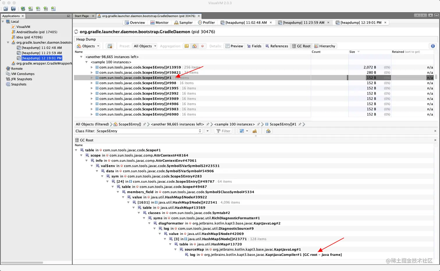 我们用 VisualVM 对 Gradle daemon 进程进行了内存分析。发现在 kapt 过程中,内存确实一直在往上涨。