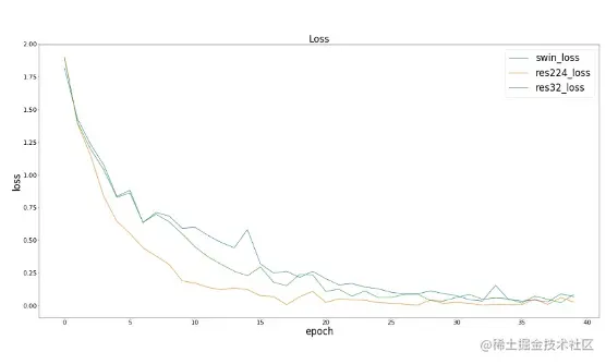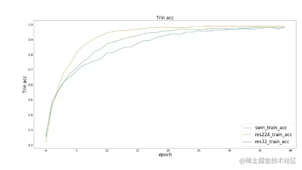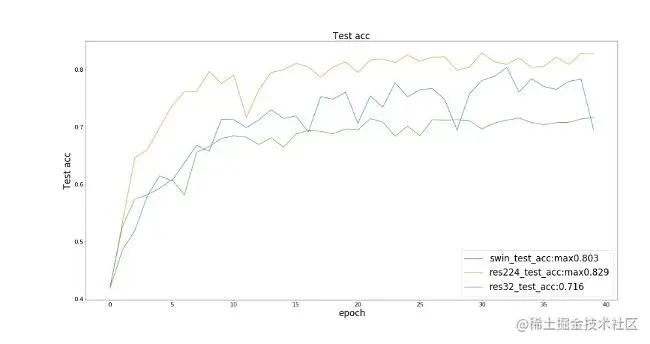我们观察到在训练损失和训练集精度上,三个模型(SwinResnet、res224、res32)达到的效果接近;而在测试精度上,SwinResnet精度达到80.3%,res224精度达到82.9%,res32精度达到71.6%。① 在精度上,SwinResnet与res224差距不大,由于这是一个小数据集,所以实际上SwinResnet的能力是受限的,而且SwinResnet整体精度是几乎线性的一个提升。② 在速度上,SwinResnet为950ms一个batch,而res224是250ms一个batch, 因此运算速度是四倍的差距实际上是可以接受的。