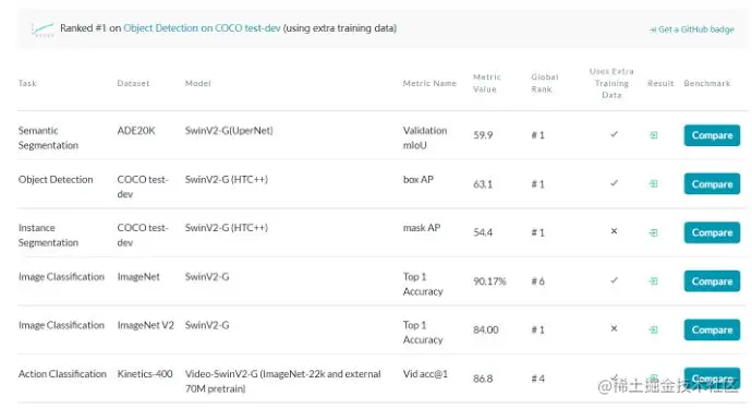 下图为paperwithcode上的截图,截止2022/1/22号,Swin Transformer在各个CV任务上依然呈现霸榜状态。在CV领域,一般在某个任务上可以提高1%就已经很了不起了,而Swin Transformer则是在各个任务上提高了2%~3%的精度。
