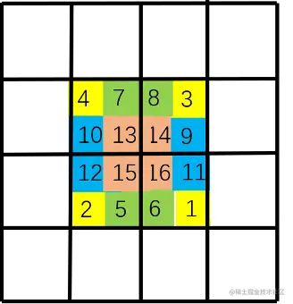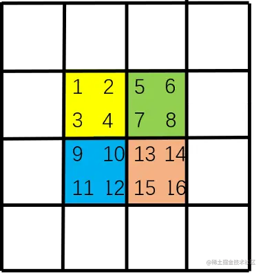 最后,将图像补回原来的大小,这一步是方便代码的编写,并且对窗口中原本不相邻的区域不做注意力运算。注意,窗口是由黑框决定的。也就是说,由于原图像中[4,7,10,13]相邻,因此左上角[4,7,10,13]一起做注意力运算;而[16,11,6,1]原本不相邻,因此右下角[16],[11],[6],[1]单独做注意力运算,而[16],[11]之间不做注意力运算。左下角[12,15],[2,5]各自相邻,因此[12,15]做注意力运算,[2,5]做注意力运算[12,15]和[2,5]之间不做注意力运算。