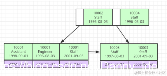 在实际项目开发中,联合索引是我们经常会用到的优化技巧之一,本文暂时先不讲优化,先从底层去理解联合索引的存储方式,后边会展开优化的讲解。例如一个联合索引里面用到了id,职位名称,出生日期三个字段,那么在存储的时候会将三个字段一起存入节点里面的key位置。如下图所示: