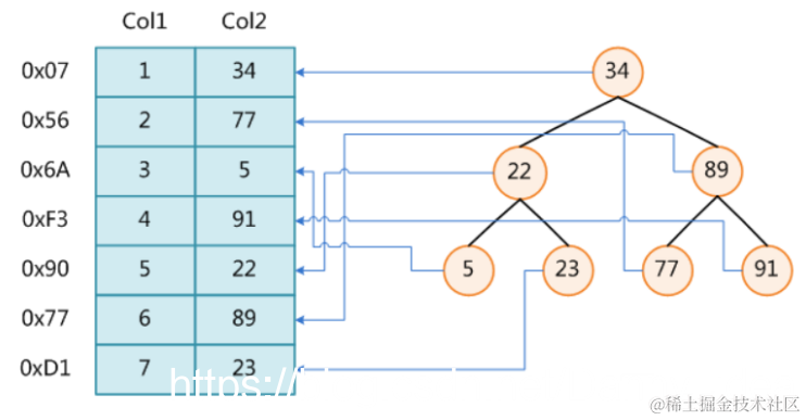如图所示,假设我们没有采用索引,要读取数据第七行(23),则需要进行7次的io读取操作。假若使用了索引,则可以通过走索引的方式,34-->22-->23一共三次io读取操作即可查找到所要的节点23。